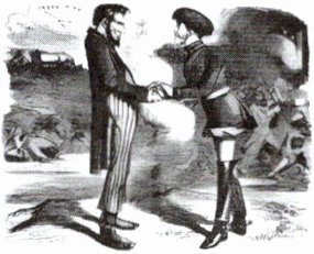 3. (2024·广东惠州一模)(跨学科·美术)1863年,一个美国人想象了从未谋面的美国总统林肯和俄国沙皇亚历山大二世会面的场景,并创作了如图所示的漫画《两极相会》。对此解读合理的是(