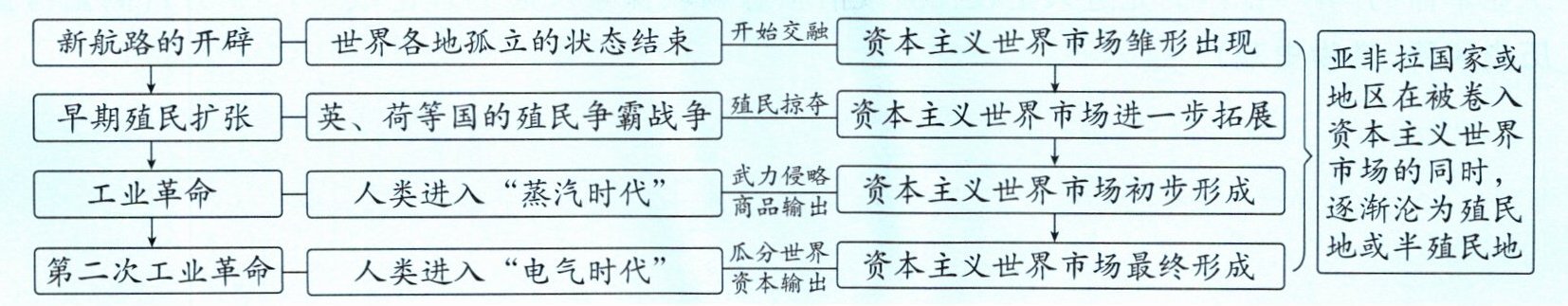 新航路开辟使资本主义世界市场雏形出现;早期殖民扩张使资本主义世界市场进一步拓展;工业革命使资本主义世界市场初步形成;第二次工业革命使资本主义世界市场最终形成,亚非拉国家或地区在这过程中逐渐沦为殖民地或半殖民地。