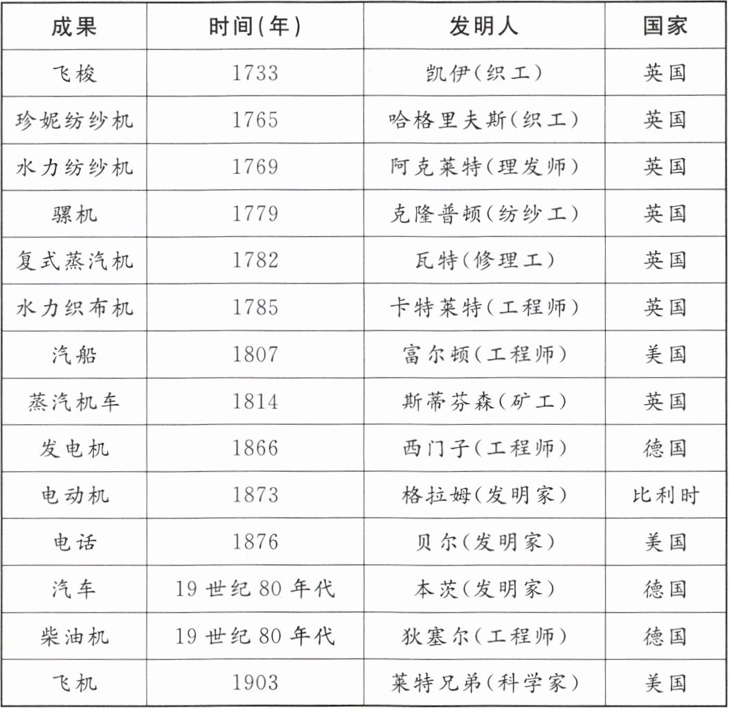 (1)第一次工业革命:科学与生产结合不紧密(发明主要来源于熟练工匠的实践);重大发明出现在英国;以蒸汽机的发明和广泛使用为标志。(任答1点得2分)