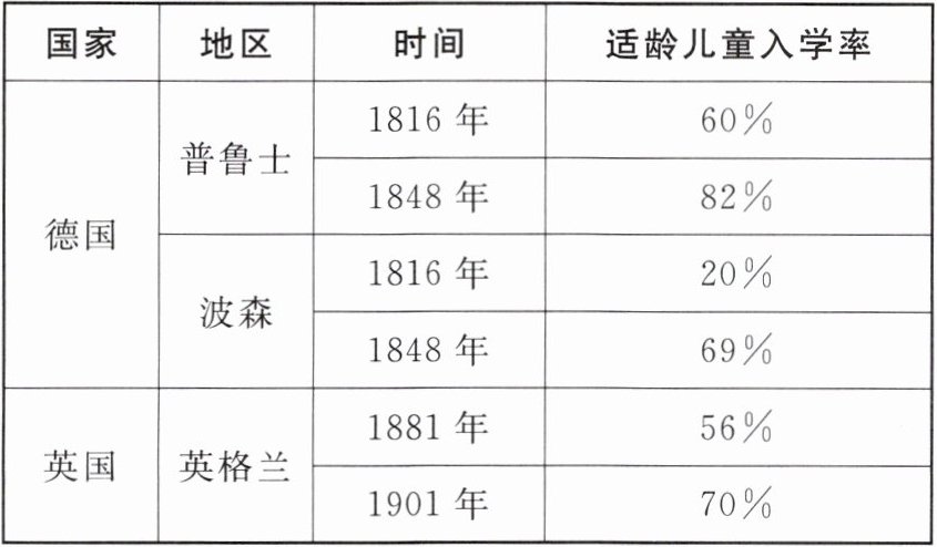 1. (2023·山西中考)如表为德国和英国不同时期部分地区适龄儿童入学率统计表。