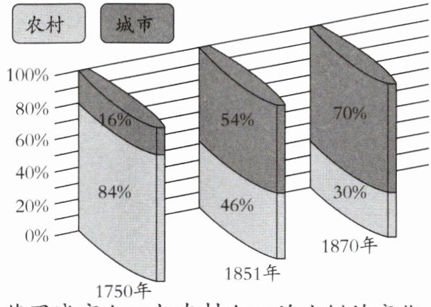 A 【解析】根据题干信息“18世纪中期至19世纪末英国城市人口与农村人口的比例变化”可知,农村人口减少,城市人口增加,结合所学知识可知,工业革命后,工商业发展,大量人口涌入城市,促进城市化的发展,A项正确;贫富分化反映的是穷人与富人的变化,题干内容没有涉及,排除B项;生产力发展迅速与科技发展相关,题干内容没有涉及,C项不符合题意,排除;环境污染指自然的或人为的破坏,向环境中添加某种物质而超过环境的自净能力而产生危害的行为,题干内容没有涉及,排除D项。故选A项。