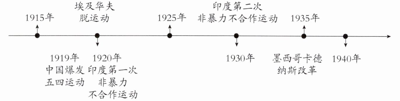 1. 运动:图 1,印度的非暴力不合作运动;图 2,埃及的华夫脱运动;图 3,墨西哥的卡德纳斯改革。(3 分)