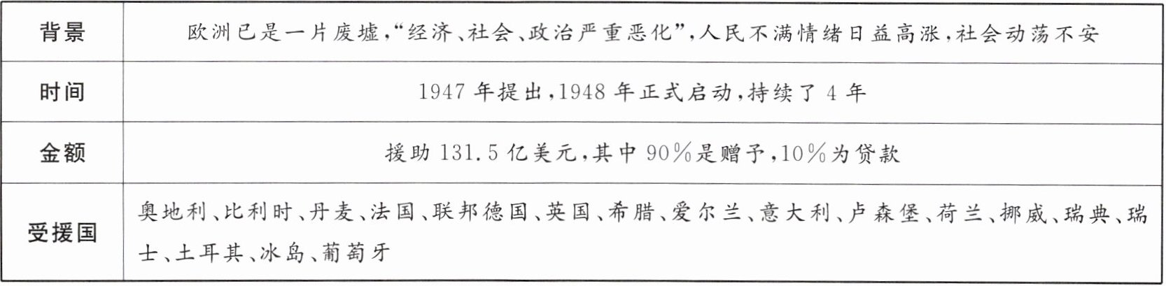(1)1947 年,美国国务卿马歇尔提出“欧洲复兴计划”,即马歇尔计划,企图通过援助西欧恢复经济,稳定资本主义制度。马歇尔计划是杜鲁门主义的一次大规模运用,也是美国实施冷战政策的又一重要步骤。(4 分)