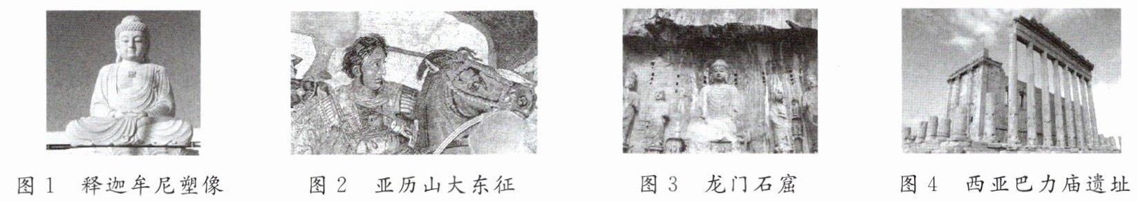 图1 释迦牟尼塑像 图2 亚历山大东征 图3 龙门石窟 图4 西亚巴力庙遗址