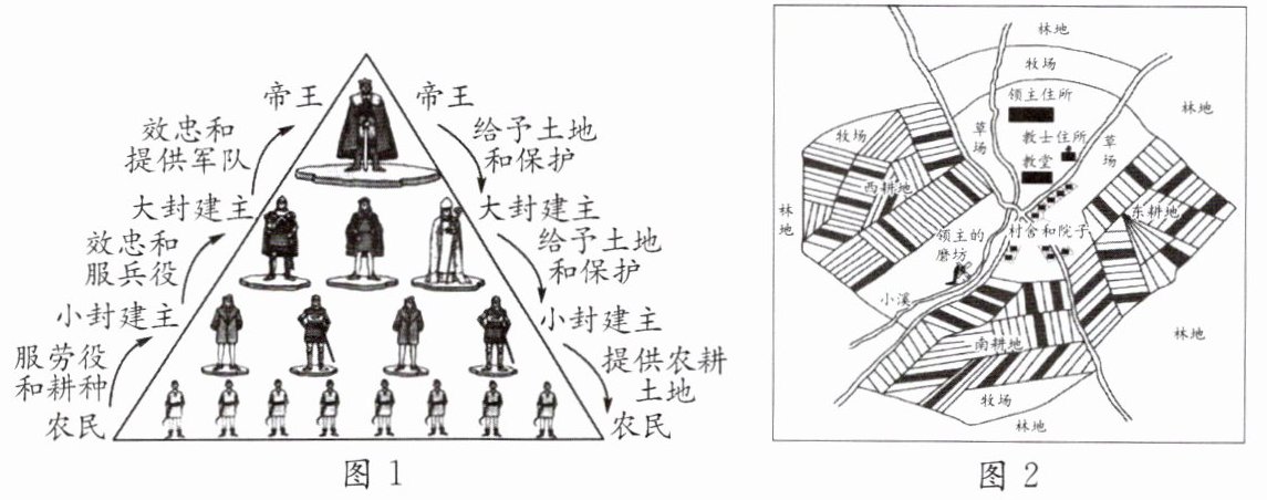 (1)材料一中图1反映的是西欧哪一种制度?这一制度是以什么为纽带而形成的?图2反映的是哪一重要的农业组织形式?这一组织形式有何特点?(4分)(侧重考查时空观念、史料实证)