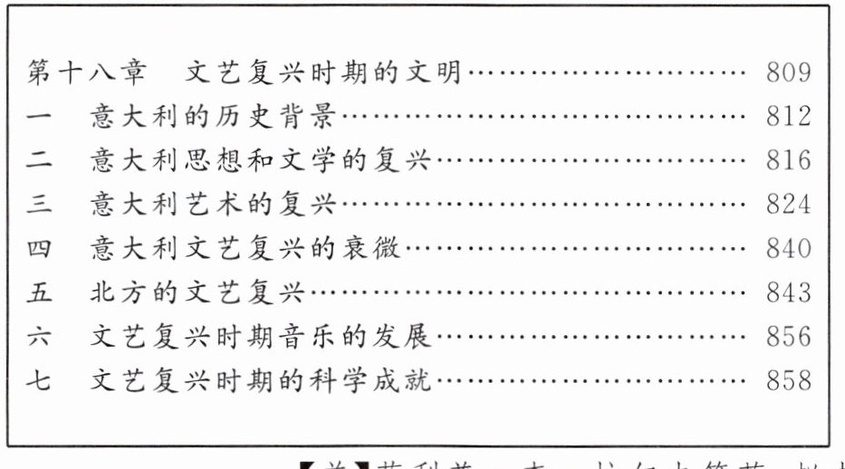 理由:目录中先介绍了意大利思想和文学的复兴,接着是艺术复兴、音乐发展和科学成就,这体现了领域的不断拓展;先阐述了意大利的文艺复兴情况,随后提到了北方的文艺复兴,这表明其地域范围的扩大。
