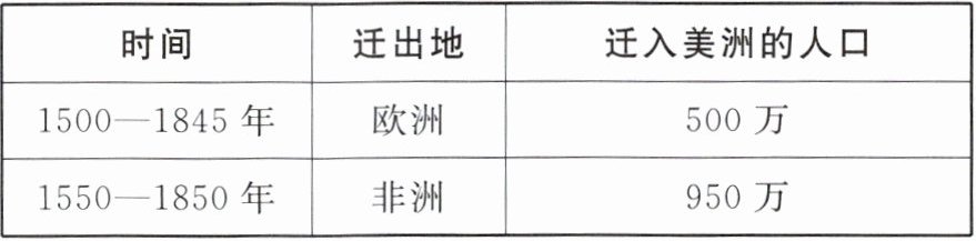 B 【解析】根据题干表格可知,1500—1845 年和 1550—1850 年迁入美洲人口数,欧洲达 500 万人,非洲达 950 万人。结合所学知识可知,从 16 世纪开始,殖民扩张引发了人口的迁移。欧洲移民到美洲,同时非洲大量的人口被贩卖到美洲,B 项正确;“非洲居民主动迁入美洲”说法错误,非洲人是被当作黑奴贩卖到美洲的,排除 A 项;题干未涉及“美洲经济发达吸引力强”,排除 C 项;题干未体现“世界市场已经完全形成”,排除 D 项。故选 B 项。