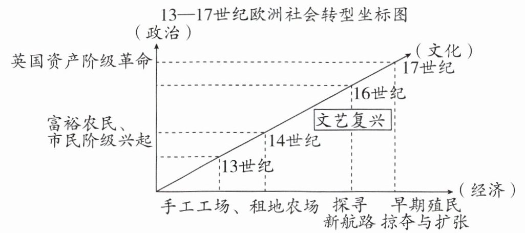 (3)历史发展是多种因素交互作用的结果。请从13—17世纪欧洲社会转型坐标图中选取两个相互关联的历史现象或事件,说明它们之间的关系。(6分)(侧重考查时空观念、历史解释)