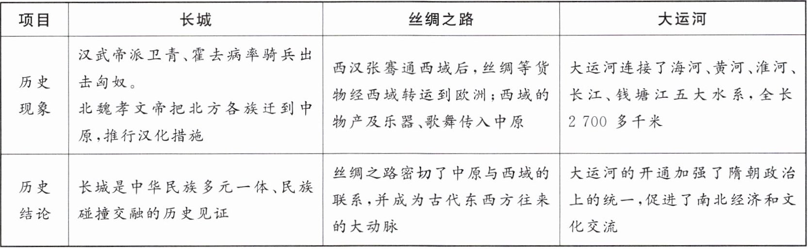 (2)历史现象:长城:秦始皇派大将蒙恬北击匈奴,并修筑长城;丝绸之路:13 世纪时,活字印刷术沿丝绸之路传到波斯;大运河:以洛阳为中心,北抵涿郡,南至余杭。(6 分)