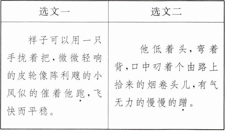 5. 两段选文中有些耐人寻味的词语,可以形成对照,进行比较阅读。请谈谈下面两句话中加点词的作用。