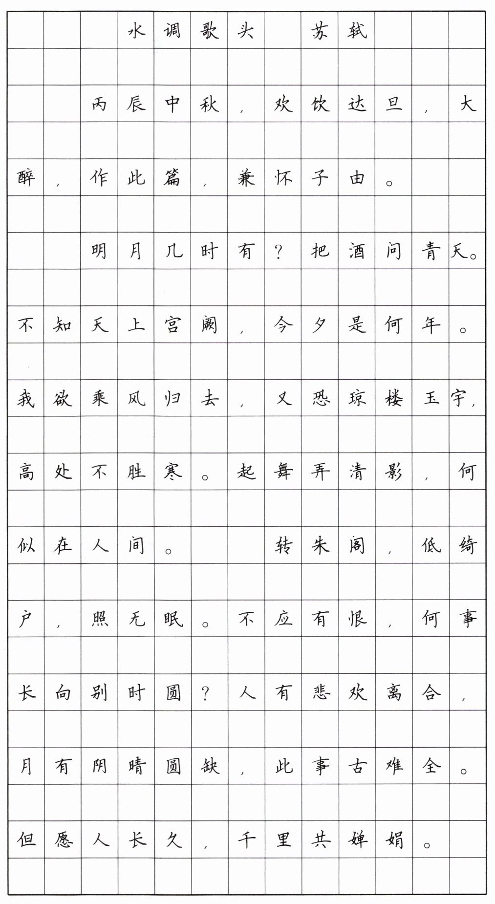 明月几时有?把酒问青天。不知天上宫阙③,今夕是何年。我欲乘风归去④,又恐琼楼玉宇⑤,高处不胜寒。起舞弄清影⑥,何似⑦在人间。 转朱阁,低绮户,照无眠⑧。不应有恨,何事长向别时圆⑨?人有悲欢离合,月有阴晴圆缺,此事古难全。但愿人长久,千里共婵娟⑩。