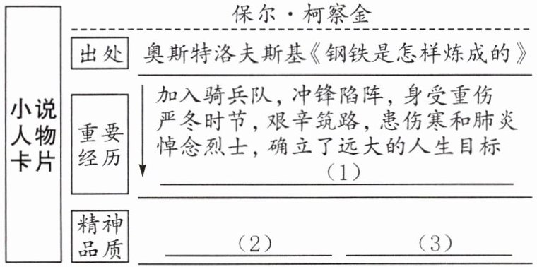 (2)“钢是在烈火与骤冷中铸造而成的”,烈火的淬炼让钢不断去除杂质,变得坚硬纯净。保尔也是在不断“去除杂质”中“淬炼成钢”的。请结合小说内容,举出一例加以分析。