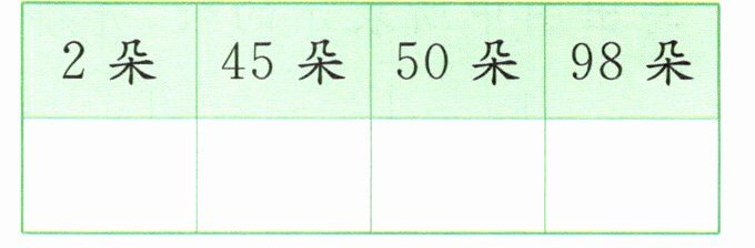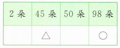 2. 小刚得到的小红花比小强少一些,小芳得到的小红花比小强多得多。已知小强得了48朵小红花,则小刚可能得了多少朵小红花?在对应的答案下面画“△”。小芳可能得了多少朵小红花?在对应的答案下面画“○”