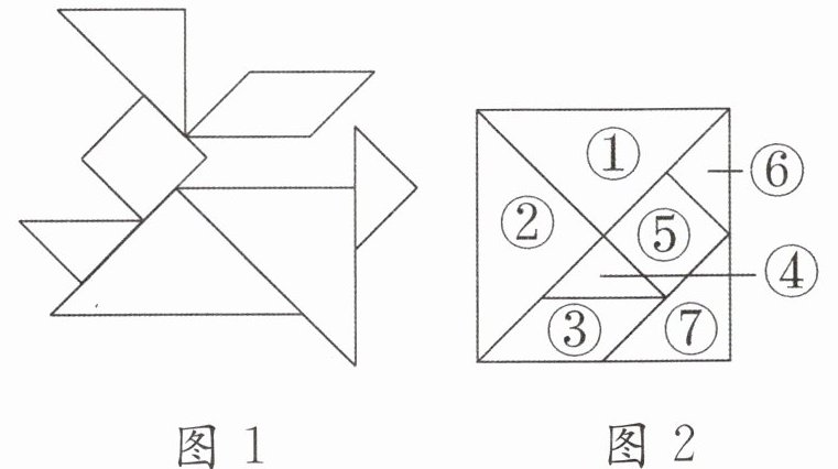1. 图1是由图2的七巧板拼成的,请在图1中写出每个图形的编号。