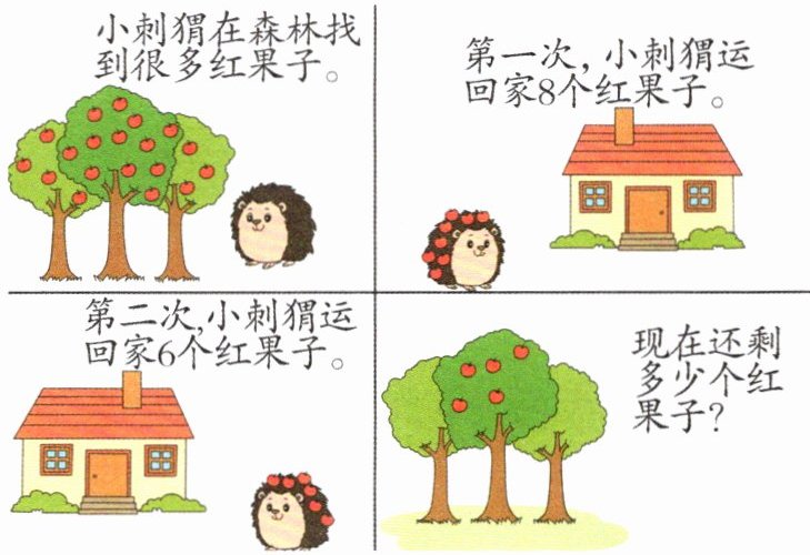 (1)小刺猬在森林里找到19个红果子。第一次运回家8个,第二次运回家6个。