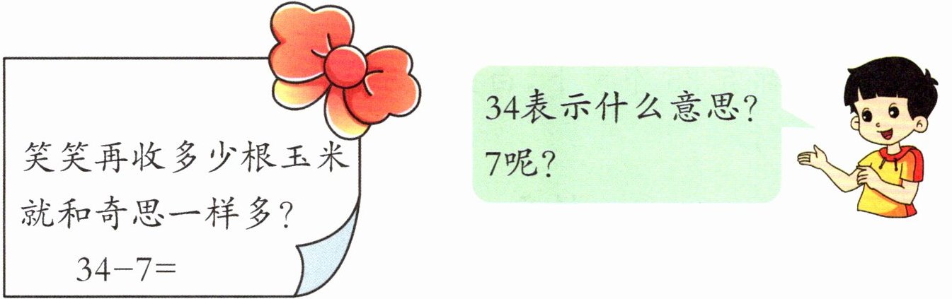 34是奇思收玉米的根数,7是笑笑收玉米的根数。