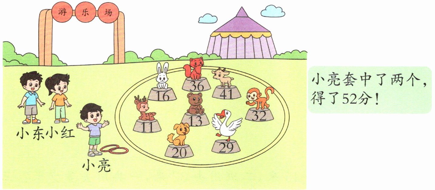 过程探索 已知小亮套中的两个动物得分和是52,我们可以把所有的数按照大小,摆放成两列,相加和是52的两个动物组成一队。