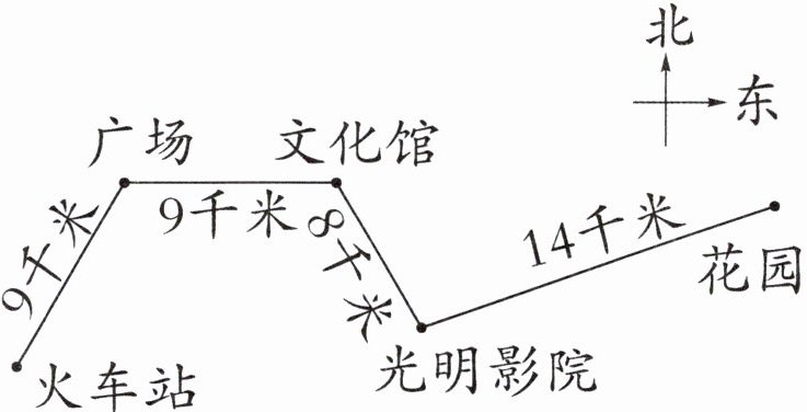1. 从火车站到花园有多少千米?小明骑自行车从火车站到花园用了5时,平均每时行多少千米?
