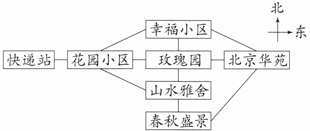 (1)玫瑰园在幸福小区的()面,在快递站的()面。