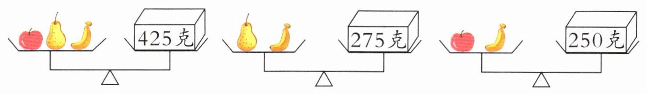 提示先根据第一幅图和第二幅图求出苹果的质量,再根据第三幅图求出香蕉的质量,最后由第二幅图求出梨的质量。
