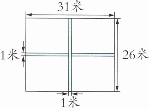 7. 王爷爷家的门前有一块长31米、宽26米的长方形菜地,为了便于浇水、施肥和捉虫,他在菜地里修了两条宽都是1米的小路(如右下图),这样就把菜地分成了四块小菜地。这四块小菜地的面积和是多少平方米?