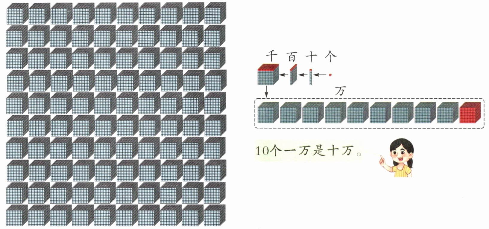 过程探索 在数小正方体时,一个一个地数,10个是一竖列,是十;一行一行地数,10行是一层,即();一层一层地数,10层是一个大正方体,即();10个大正方体摆成一行,这一行有10个一千,即()。图中有10行大正方体,有10个一万,即()。