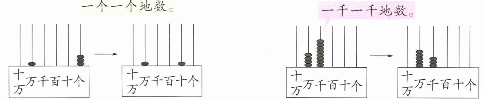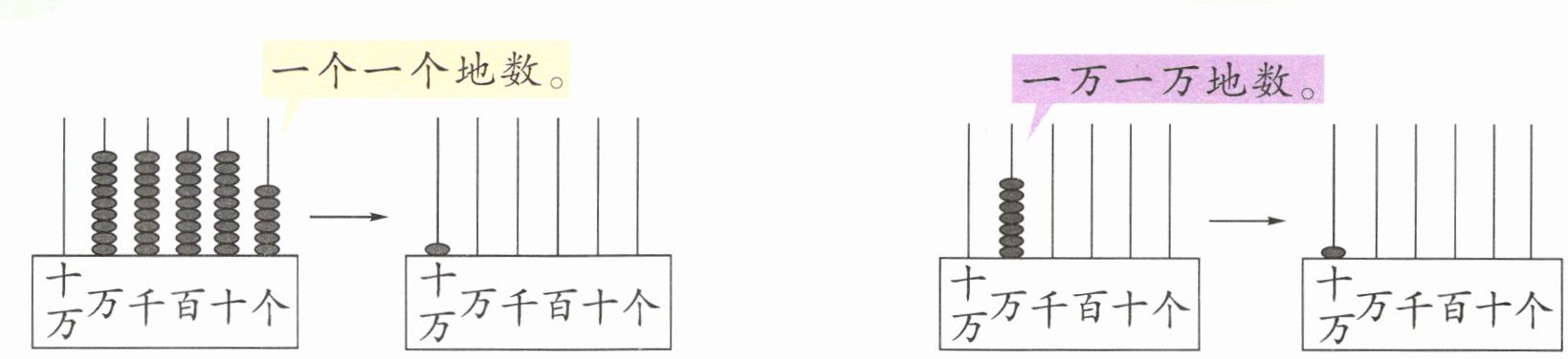 完全解答 通过拨一拨、数一数可知:一个一个地数,10个一是十;一千一千地数,10个一千是一万;一万一万地数,10个一万是十万。
