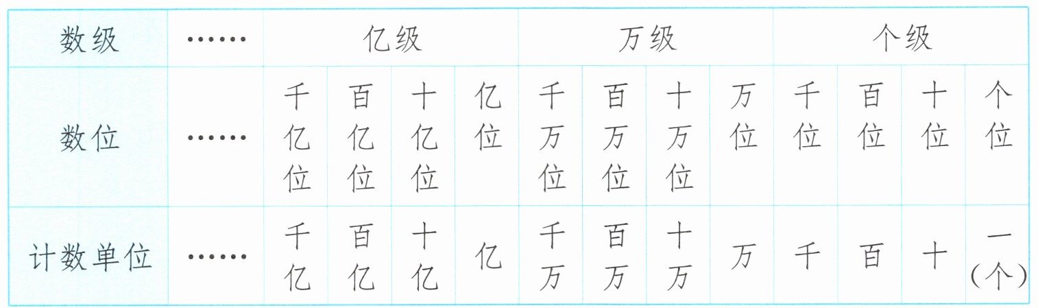 完全解答 从右边起每四个数位是一级,分别是个级、万级、亿级……每一级有4个计数单位,类似“个、十、百、千”。每个计数单位对应一个数位。