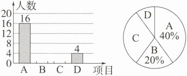 9. (2024南充改编)某研学基地开设有A,B,C,D四类研学项目.为了解学生对四类研学项目的喜爱情况,随机抽取部分参加完研学项目的学生进行调查统计(每名学生必须选择一项,并且只能选择一项),并将调查结果绘制成两幅不完整的统计图,如图所示.