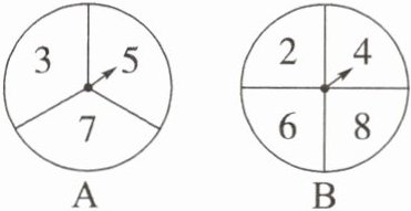 9. 有A,B两个转盘,A转盘被均分成三份并标有数字3,5,7,B转盘被均分成四份并标有数字2,4,6,8(如图所示),先转者可优先选择转动其中的一个转盘,后转者则只能转动剩下的转盘,指针停止时指向的数字大的一方获胜(指针指向分界线时需要重新转动转盘).