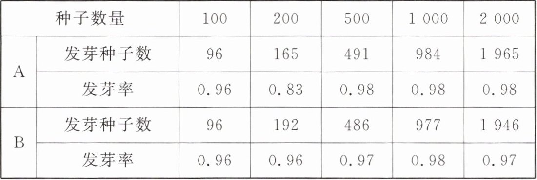 下面有三个推断:①在同样的地质环境下播种,A种子的发芽率可能会高于B种子;②当试验种子的数量为100时,两种种子的发芽率均为0.96,所以它们的发芽概率一样;③随着试验种子数量的增加,A种子的发芽率在0.98附近摆动,显示出一定的稳定性,可以估计A种子发芽的概率是0.98.其中不合理的是____