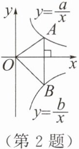 2. (2024 福州二模)在平面直角坐标系中,反比例函数$y= \frac {a}{x}(x>0)和反比例函数y= \frac {b}{x}(x>0)$的图象如图所示。若一条垂直于$x轴的直线分别交这两个反比例函数的图象于A$,$B$两点,则$\triangle AOB$的面积是(