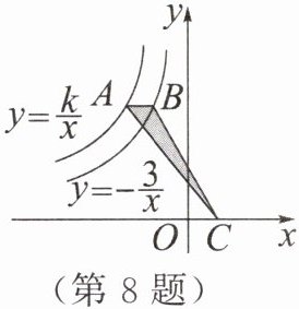 8. 如图,A是反比例函数 $ y = \frac{k}{x}(x < 0) $ 的图象上的一点,过点A作x轴的平行线交反比例函数 $ y = - \frac{3}{x}(x < 0) $ 的图象于点B.若点C在x轴上,且 $ S_{\triangle ABC} = 1 $,则k的值为