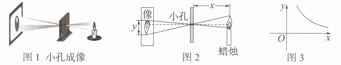 13. 跨学科大约在两千五百年前,墨子和他的学生做了世界上第一个小孔成像的实验,并在《墨经》中有这样的精彩记录:“景到,在午有端,与景长,说在端.”大意是:影像倒立,在光线交会处有一小孔;关于影像的大小,在于小孔相对物像的位置.如图所示,图2是图1中小孔成像实验的示意图,在图2中,根据小孔成像的科学原理,当像距(小孔到像的距离)和物高(蜡烛火焰高度)不变时,火焰的像高y(单位:cm)是物距(小孔到蜡烛的距离)x(单位:cm)的反比例函数,图象如图3所示,且当 $ x = 6 $ 时,$ y = 3 $.
