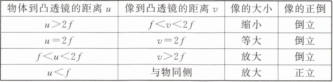 素材一:凸透镜成像规律:$f$(单位:$cm$)表示凸透镜的焦距,$u$(单位:$cm$)表示物体到凸透镜的距离(物距),$v$(单位:$cm$)表示像到凸透镜的距离(像距),规律如下表。