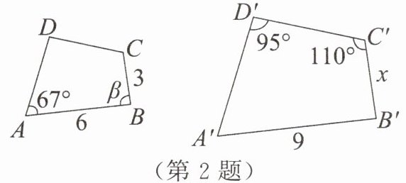 2. (2025福州一检)如图,若四边形 $ ABCD \backsim $ 四边形 $ A ^ { \prime } B ^ { \prime } C ^ { \prime } D ^ { \prime } $, 则 $ B ^ { \prime } C ^ { \prime } $ 的长度 $ x $ 和角 $ \beta $ 的大小分别是 (
