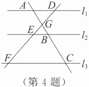 4. 如图,直线 $ l _ { 1 } // l _ { 2 } // l _ { 3 } $, 直线 $ AC $ 分别交直线 $ l _ { 1 }, l _ { 2 }, l _ { 3 } $ 于点 $ A, B, C $, 直线 $ DF $ 分别交直线 $ l _ { 1 }, l _ { 2 }, l _ { 3 } $ 于点 $ D, E, F, AC $ 与 $ DF $ 相交于点 $ G $. 若 $ DG = 3, GE = 2, EF = 6 $, 则 $ \frac { A B } { B C } $ 的值为______