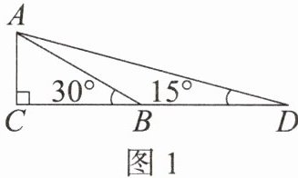 13. 类比思想构建几何图形解决代数问题是“数形结合”思想的体现。例如,直接计算$\tan 15^{\circ}$比较麻烦,此时我们就可以用“数形结合”的思想求解。如图1,在$Rt\triangle ACB$中,$\angle C = 90^{\circ}$,$\angle ABC = 30^{\circ}$,延长$CB到点D$,使$BD = AB$,连接$AD$,可得$\angle D = 15^{\circ}$。