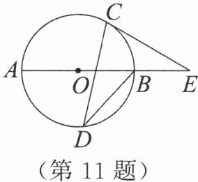 11. 如图,$AB是\odot O$的直径,$C$,$D是\odot O$上的点,$\angle CDB = 30^{\circ}$。若过点$C作\odot O的切线交AB的延长线于点E$,则$\cos E$的值为______