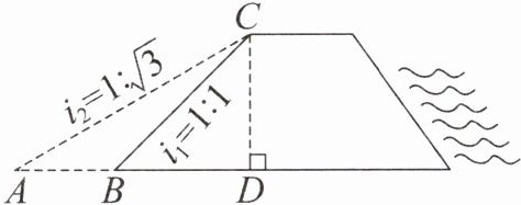 5. 某水库大坝的横截面如图所示,坝高 $C D= 20 \mathrm{~m}$,背水坡 $B C$ 的坡度 $i_1= 1: 1$。为了对水库大坝进行升级加固,降低背水坡的倾斜程度,设计人员准备把背水坡的坡度改为 $i_2= 1: \sqrt{3}$,求背水坡新起点A与原起点B之间的距离(结果保留小数点后一位,参考数据:$\sqrt{2} \approx 1.41, \sqrt{3} \approx 1.73$)。