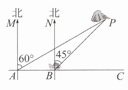 2. (教材 $P_{77}$ 练习 $T_1$ 变式) 如图,海中有一个小岛P,它的周围9n mile内有暗礁,渔船跟踪鱼群由西向东航行,在点A测得小岛P在北偏东60°方向上,航行6n mile到达B点,这时测得小岛P在北偏东45°方向上。如果渔船不改变航线继续向东航行,有没有触礁的危险?请说明理由(参考数据:$\sqrt{2} \approx 1.414, \sqrt{3} \approx 1.732$)。