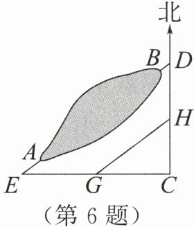 6. 如图,在铁路建设中,需要确定隧道两洞口A和B的距离。点D,点E分别位于测绘点C的正北和正西方向。已知测得两定位点E和D与隧道口A和B的距离分别为200m和100m,测绘点H,G分别为CD,CE的中点,测绘方在测绘点H测得点G在点H的南偏西53°的方向上,且 $H C= 480 \mathrm{~m}$,则隧道AB的长约为 (参考数据:$\sin 53^{\circ} \approx 0.8, \cos 53^{\circ} \approx 0.6, \tan 53^{\circ} \approx 1.3$) (