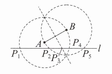 方法:分别以点 A,B 为圆心,以线段 AB 的长为半径作圆,再作 AB 的垂直平分线,两圆和垂直平分线与 l 的交点即为点 P