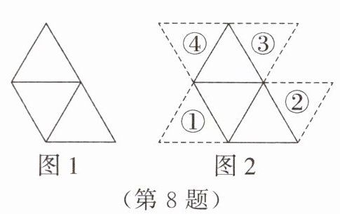 8.三个全等的等边三角形按图1所示的位置摆放,现添加一个大小相同的等边三角形,使四个等边三角形组成一个中心对称图形,如图2所示,则添加的等边三角形所放置的位置是
