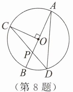 8.如图,在$\odot O$中,直径$AB$,弦$CD相交于点P$,连接$OC$,且$OC\perp AB$.若$\angle A= 20^{\circ}$,则$\angle BPD$的度数为