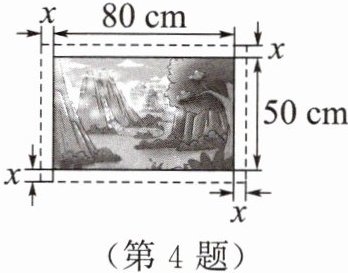 4. “指尖上的非遗——麻柳刺绣”,针线勾勒之间,绣出世间百态。在一幅长80cm、宽50cm的刺绣风景画的四周镶一条金色纸边,制成一幅矩形挂图,如图所示。如果要使整个挂图的面积是$5400cm^2,$设金色纸边的宽度为x cm(风景画四周的金色纸边宽度相同),那么列出的方程为(