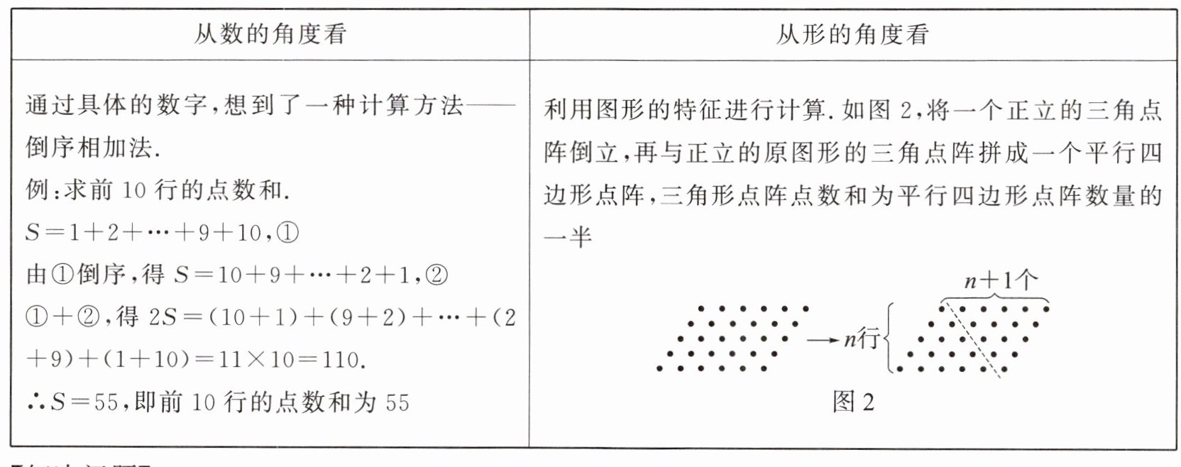 【发现问题】在探究的过程中,容易发现10是三角点阵中前4行的点数和,但是遇到较大的点数时,"逐个数"行数很烦琐.