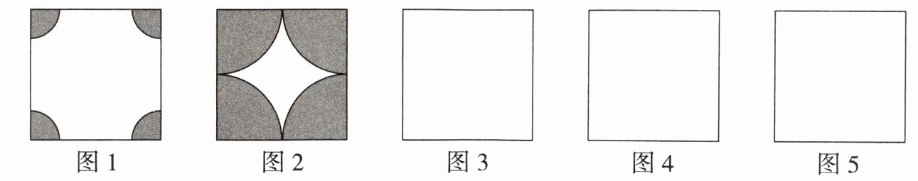 4. 能力提升 为创建绿色校园,学校决定在一块正方形的空地上种植花草,现向学生征集设计图案.图案要求只能用圆弧在正方形内加以设计,使正方形和所画的圆弧构成图案,种植花草部分用阴影表示. 请你运用平移、旋转、轴对称等知识,在图 3、图 4、图 5 中画出三种不同的设计图案(温馨提示:在两个图案中,只有半径变化而圆心不变的图案属于同一种,例如:图 1、图 2 只能
