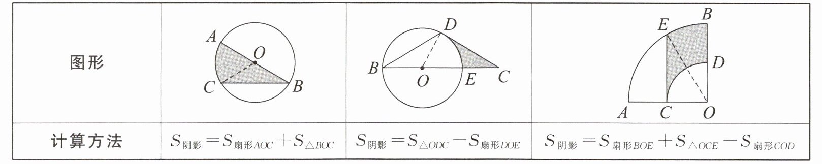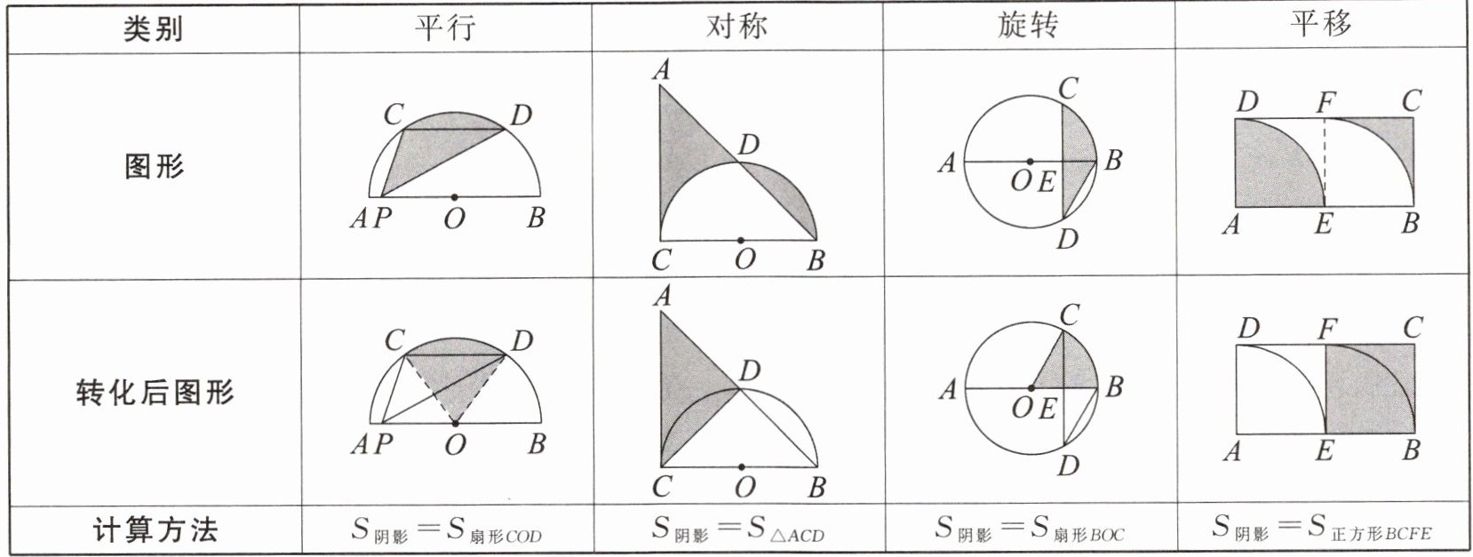 |计算方法|$S_{阴影}= S_{扇形COD}$|$S_{阴影}= S_{△ACD}$|$S_{阴影}= S_{扇形BOC}$|$S_{阴影}= S_{正方形BCFE}$|