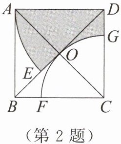2. 如图,在正方形$ABCD$中,点$O$为对角线的交点,以点$C$为圆心,以$OC$为半径作弧,交$BC于点F$,交$CD于点G$,以点$D$为圆心,以$AD$为半径作弧,交$BD于点E$。若$AB= 1$,则阴影部分的面积为____。